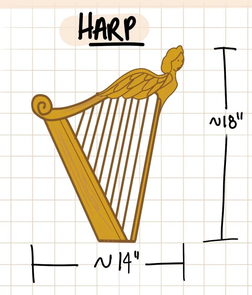 Toys included a rolling wooden hen and golden egg, a carriage pulled by rolling horses, a larger stand-up horse, a golden harp with a sculpted singing angel’s head, miniature character figurines designed to replicate actors’ costumes, and a wooden forest “play set” with removable flowers. Most pieces were hand-carved from 1-inch pine boards laminated to appropriate thickness. Details included wooden dowels, balsa wood, wooden wheels, and paint wash.